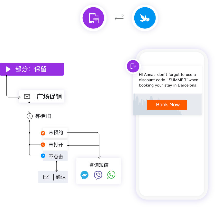 通过号码归属地选择人群,圈选出不同城市、N线城市的人群,对不同人群编辑不同的短信文案进行触达,提升转化效果。