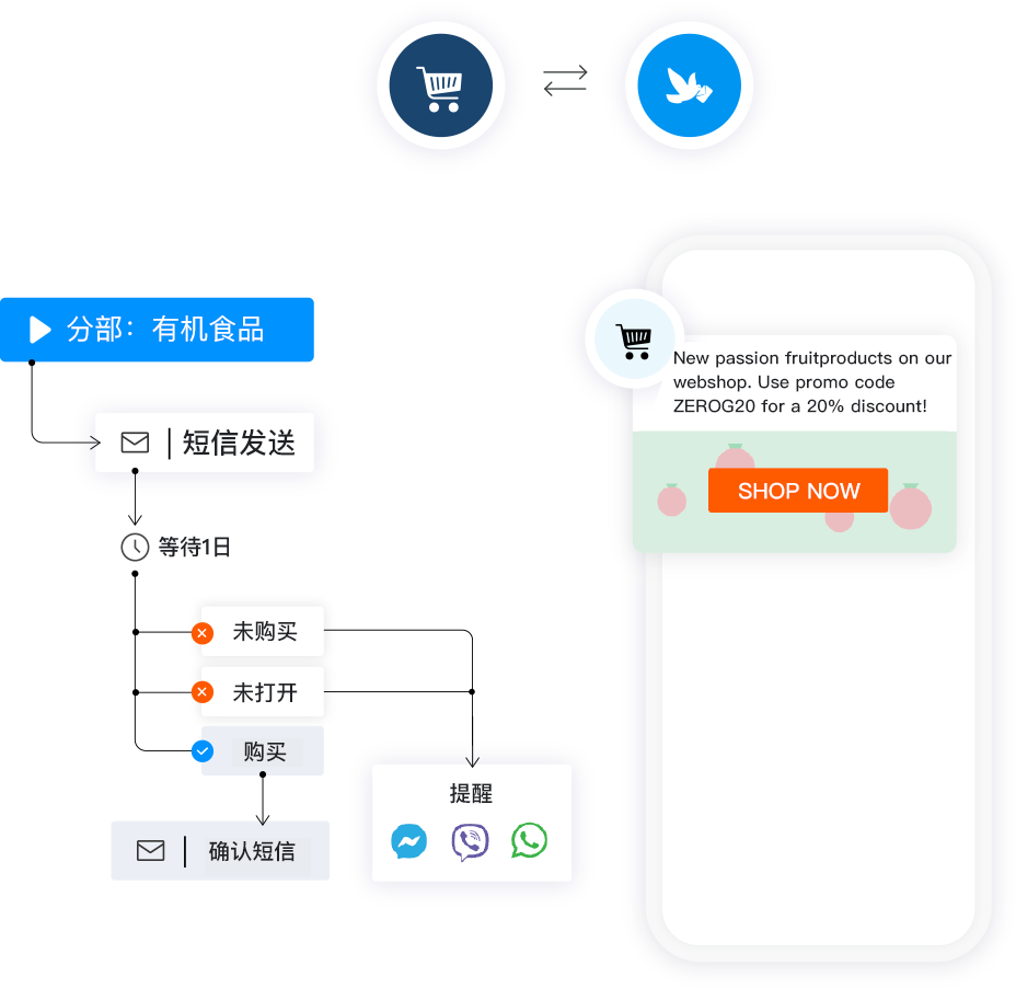 通过在正确的时间正确发送到客户偏爱的沟通渠道的自动化广告系列,使您的客户回到他们废弃的购物车中。